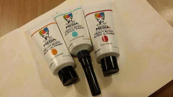 Today’s technique is not new, but I updated it by using Dina Wakley’s new Media Paint colors. By the time I was finished filming Wednesday’s video, I knew how I wanted the background to look and had chosen my colors: Cheddar, Fuchsia, Turquoise (which is not a new color). When you look at the photos it may seem as though there is another one present, but it’s where the Cheddar and Fuchsia blend (often on my finger) that the new color appears. Turquoise is my accent color; you’ll see it applied very sparingly. I only wanted to see little hints of it.