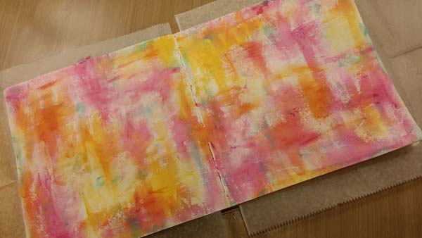 I’m going to include photos of the spread as I added the colors to the background, but will refer you to the original video for a thorough description of how to step through the process. You’ll need Gesso, a Palette Knife, and your choice of colors of Media Paint.