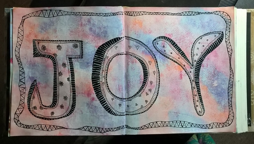 The theme for today is “pick a word”. I chose ‘kindness’. Since the word is the focal point, I used really large letters to emblazon it across the span of the spread. I think it will be interesting to see the variety of words selected by those of you participating in the AJA. I’m looking forward to it and hope you’ll share your work here in the blog comments and/or on the Facebook group.