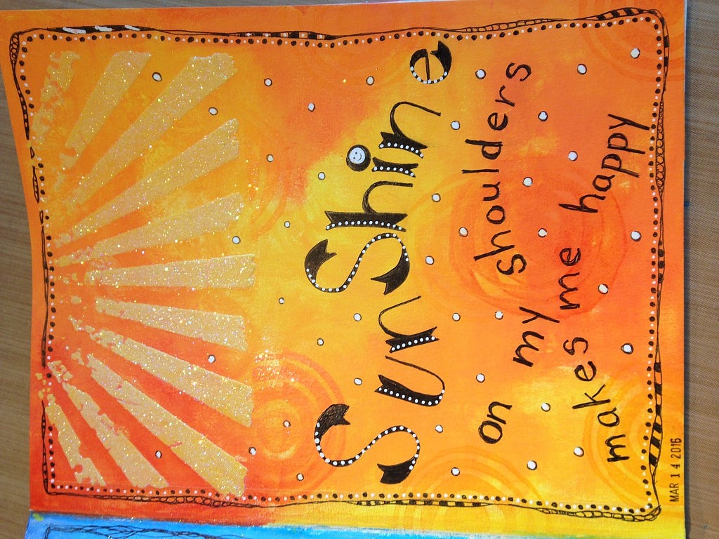 I was sitting on my deck enjoying the wonderful south Texas weather (sorry to those of you in snow country) thinking about the word I would choose. The sun was warming my shoulders and suddenly I was channeling John Denver! So here is my word and my page. Barb, I have trouble using my fingers to spread the paint and then realized I had gessoed the page and was using Dylusions paints. Oh, well. You might recognize your new foam stamp in the background! Extreme fun as always! Thank you for the great ideas.