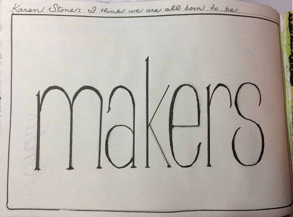 Ok, Barb, I have finally – and happily! – lettered a whole word. Thank you for “pushing” us! The word is a quote from award-winning quilter Karen Stone, who stated that she thinks we are all born to be makers. I can see in the photo that I need to erase better before I apply color over the Pitt pen. I inserted a page of Arches textwove paper into the journal for this, and the watermark is visible on the left side. Love that paper, need to make a whole journal of it!