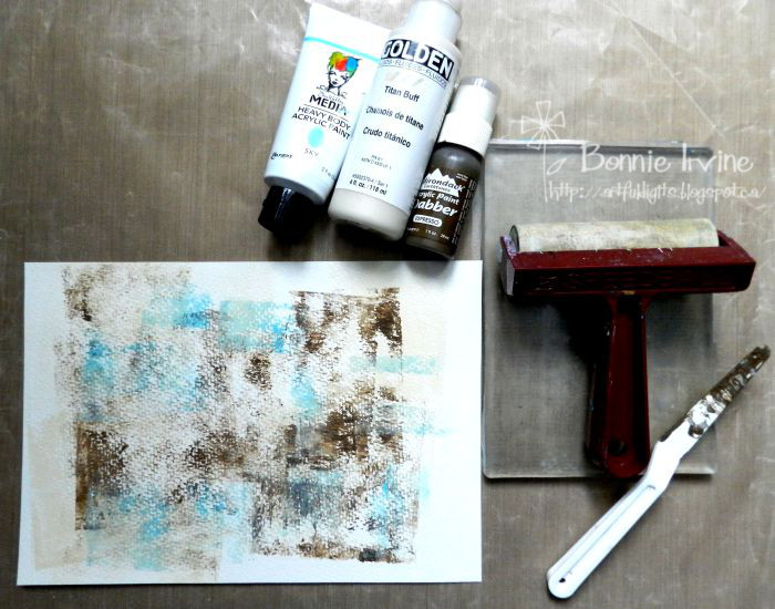 I began with a 7×10 inch rectangle of cold press watercolor paper, choosing the more textured side to brayer my paint onto. Often when I use my brayer to apply paint to the background, I also use my 5 x 7 gel press plate so that I can pull a few prints at the same time. I started with Golden Titan Buff, just skimming the brayer over the paper here and there so that I wouldn’t get solid coverage. While I kept the paint going horizontal and vertical, I did turn the page to change it up a little. Next was Adirondack Espresso, followed by Dina Wakley Media Sky Acrylic Paint.