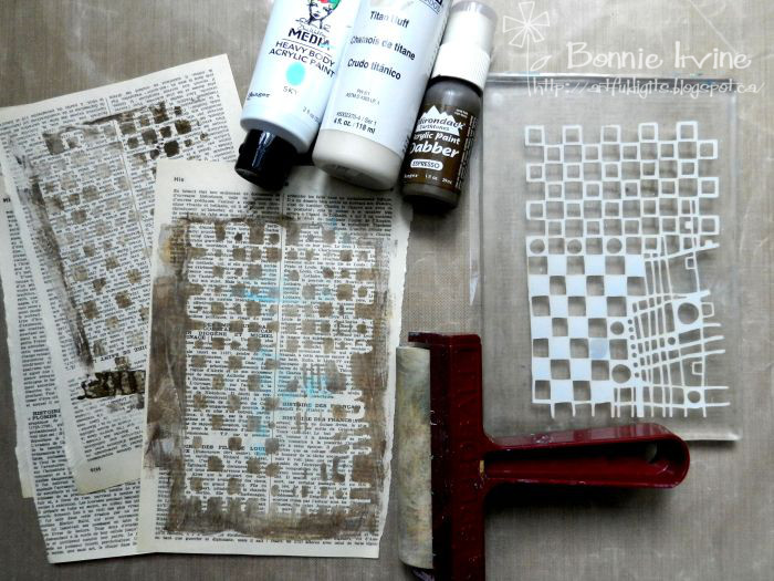 While I had the cream and brown paints on my Gel Press Plate, I layered Carabelle Studio Squares and Circles Art Template over them, pulled a print onto book paper, and then removed the template so I could pull the reverse print onto another sheet of book paper. When I brayered the blue onto the page background, I also scuffed a little onto the book pages.