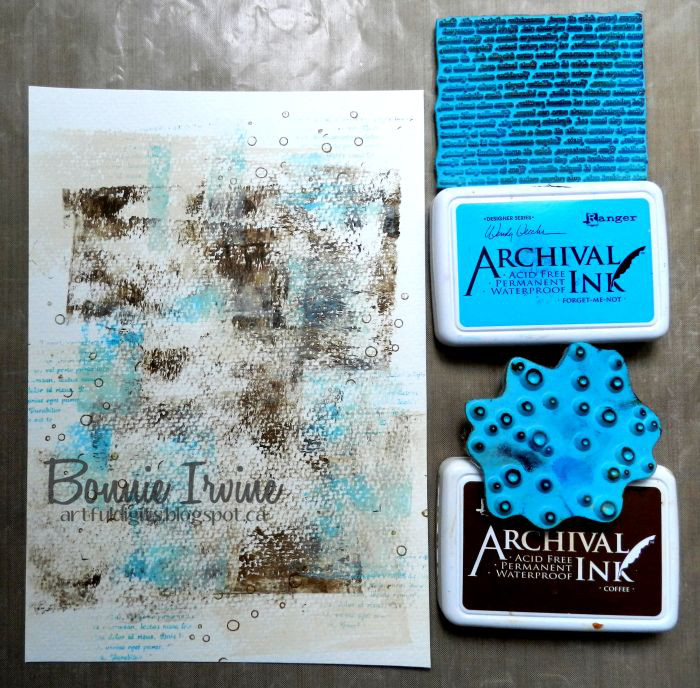 Coffee Archival Ink was used to apply Joggles Background Noise – Circles stamp here and there. Forget-Me-Not Archival Ink was used to stamp Joggles Nonsense Latin Text mainly around the outside because I knew I was covering the middle of the page.