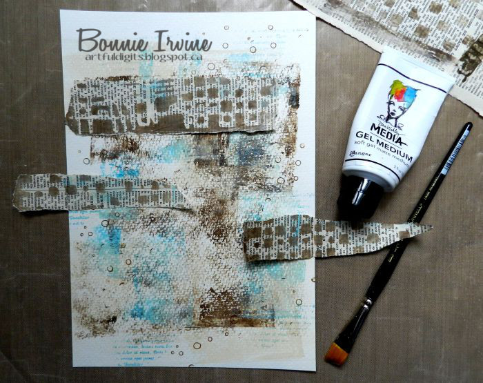 Here’s where those Gel Press prints came into play. They were torn into strips and adhered to the background with Dina Wakley Media Gel Medium to break up the painted areas and add a little more visual texture.