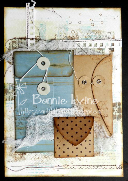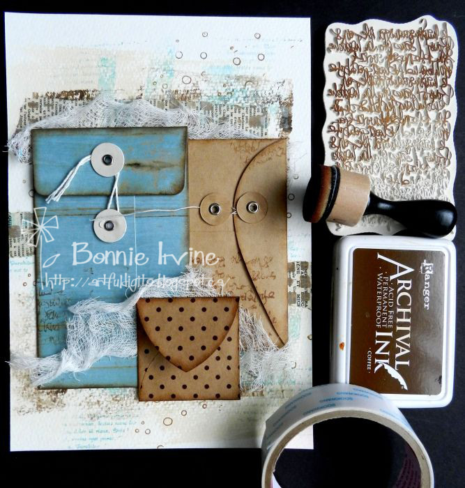 Three envelopes which have been in my stash for years finally made their debut. First the two plain ones were stamped with Carabelle Studio Handwritten in Pen Background stamp and all edges of the three were inked with the same Coffee Archival Ink using a Mini Ink Blender tool. Then two lengths of cheesecloth were added with Scor Tape, one behind the top two envelopes slightly covering the text paper, and one between the smallest envelope and the other two.