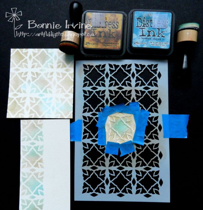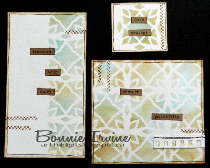 Three inserts for the envelopes were cut from the left over watercolour paper. They were then stencilled using Joggles/Margaret Applin Designs Global #3 stencil with Broken China and Vintage Photo Distress Inks.