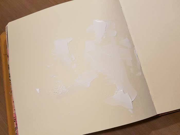 The pages in the Dylusions Square Kraft Journal are manila colored, so I knew I could scrape on gesso and it would be visible. I grabbed a jar of Dina Wakley’s White Gesso and her Palette Knife and did just that, applying it quickly and randomly.