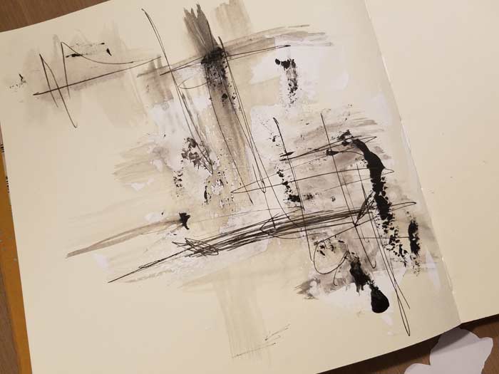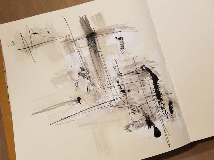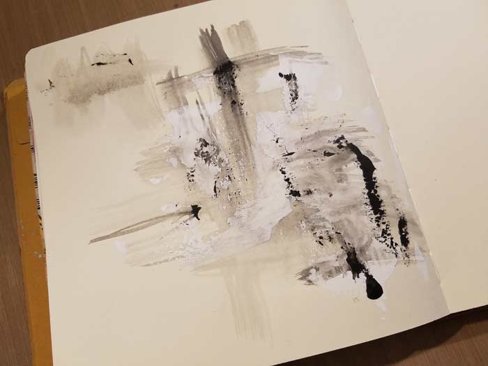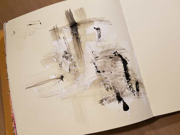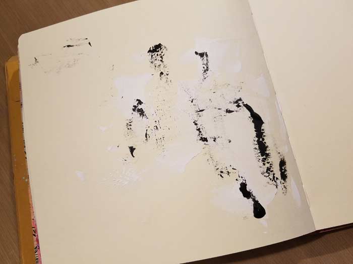 I like what I had but decided I needed something for contrast and since I was also of the mindset to limit the colors I used, I went for Dina’s Black Gesso, though I added quite a bit less.