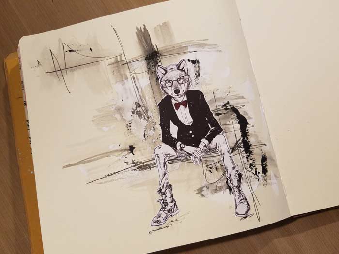 By this point I’d chosen the character from the Anthropomorphic 2 Collage Sheet, the sitting one. Since he’s sitting he needed somewhere to perch, otherwise he’d look like he was just floating. With that in mind I scribbled an area to suggest a horizontal place to park him.