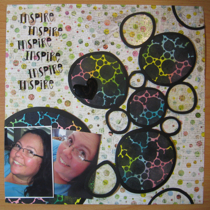 Next, stamp Joggles Inspire Cling Stamp onto transparency with Versamark Ink to form an irregular column of the word “Inspire.” Heat emboss with black embossing powder and attach to the upper left corner of the layout. Then, add a photo cluster to the lower left corner.