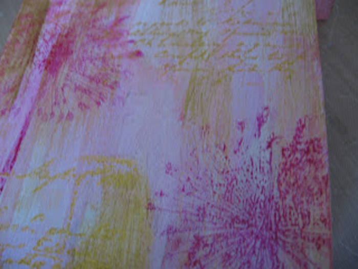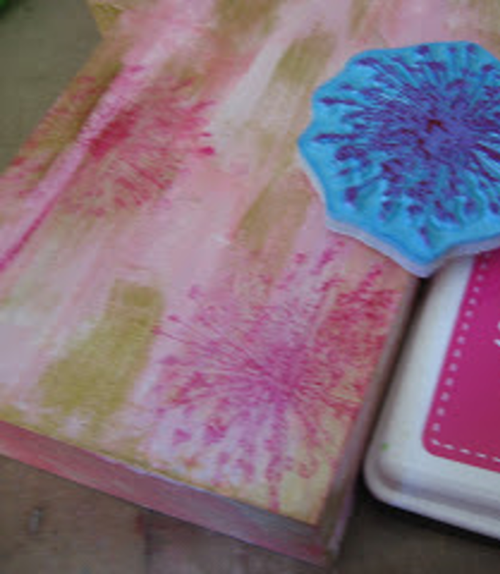 When the paint was dry, I decided which stamps I would use to add texture to the background. I used dark pink ink to apply Joggles/Margaret Applin Designs Cling Rubber Skeleton flower stamp, and stamped it randomly on the front, back, and sides.