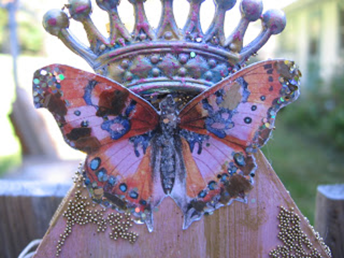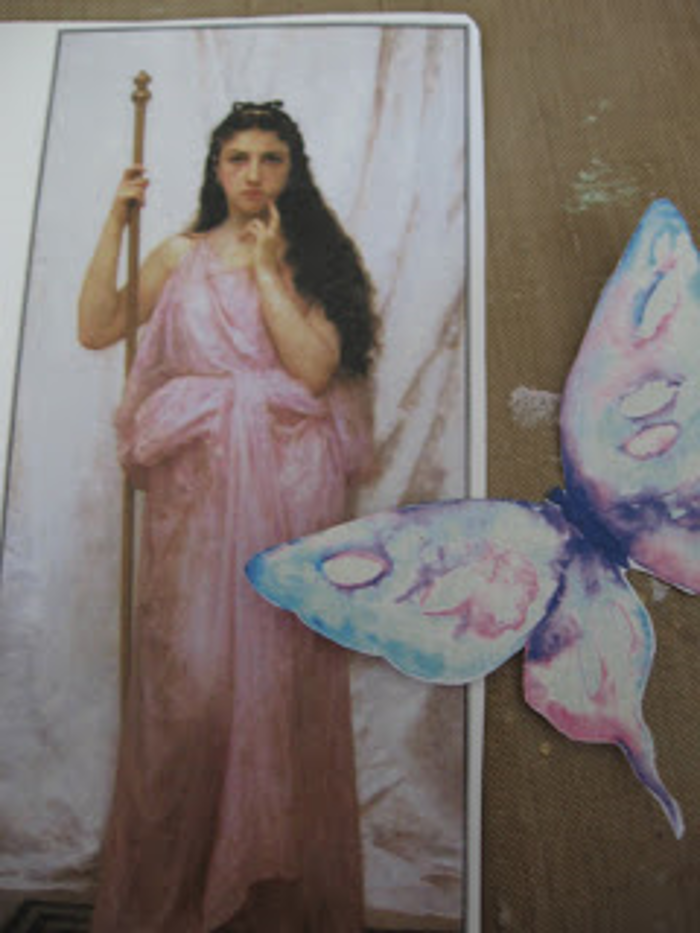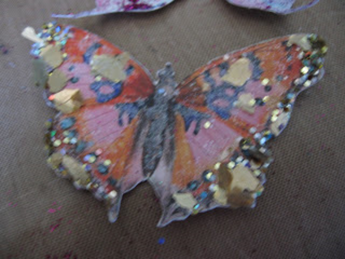 Next, I worked on putting my own twist on the cut-out collage images. I used clear drying white glue on the edges of the butterfly, and also on some of the spots. I then sprinkled gold mica flakes and glitter mix on top of the glue and set the butterfly aside to dry.