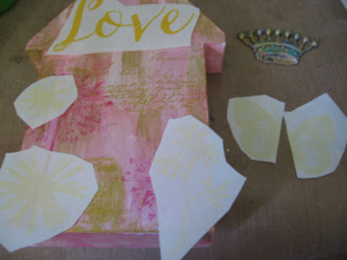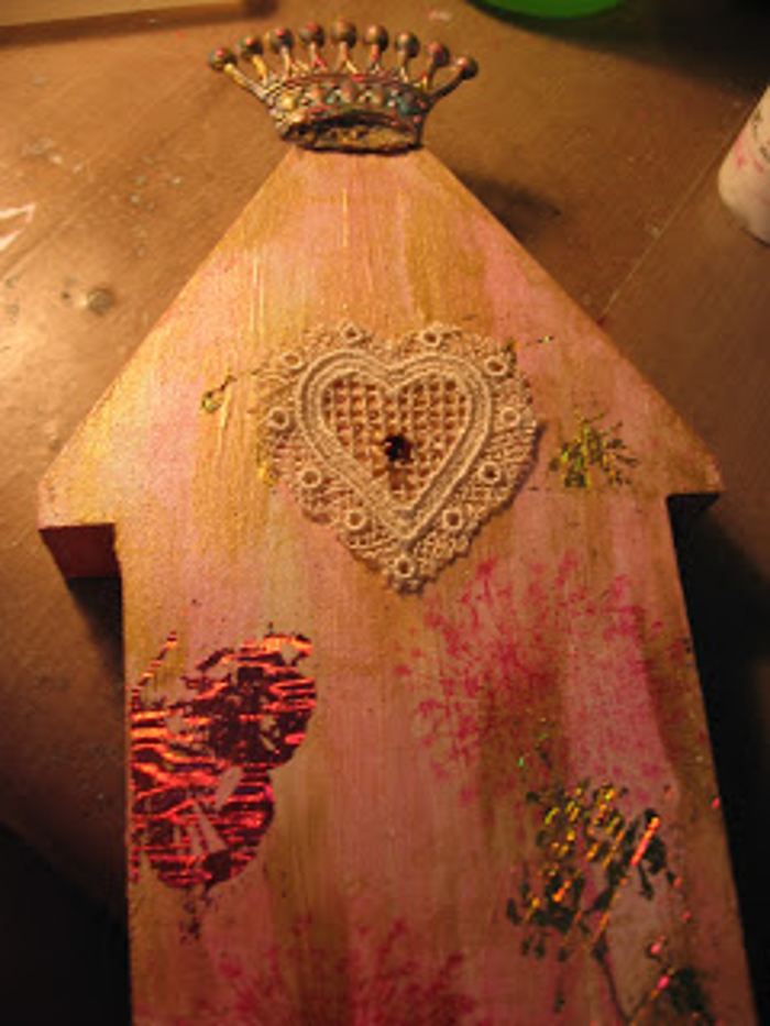 Now it was time to add my embellishments. I started with a crown from Tim Holtz Idea-ology line and using the transfer glue, gave it a little foil treatment as well. I also used a vintage heart applique in the middle of the house, adhering it with white glue.