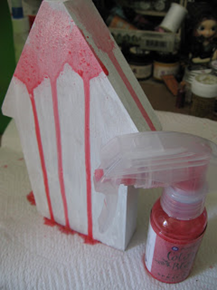 Once the gesso was dry, I sprayed on some of the Peony colour bloom spray in various places. Remember to do both sides of your house, too!