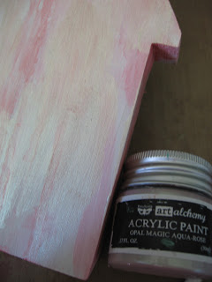 I dried the spray with my heat tool and then it was time to apply my first colour of paint, Art Alchemy Opal Magic Aqua-Rose. I applied a light coating in random spots all over the house, mixing it in with the darker pink of the bloom spray.