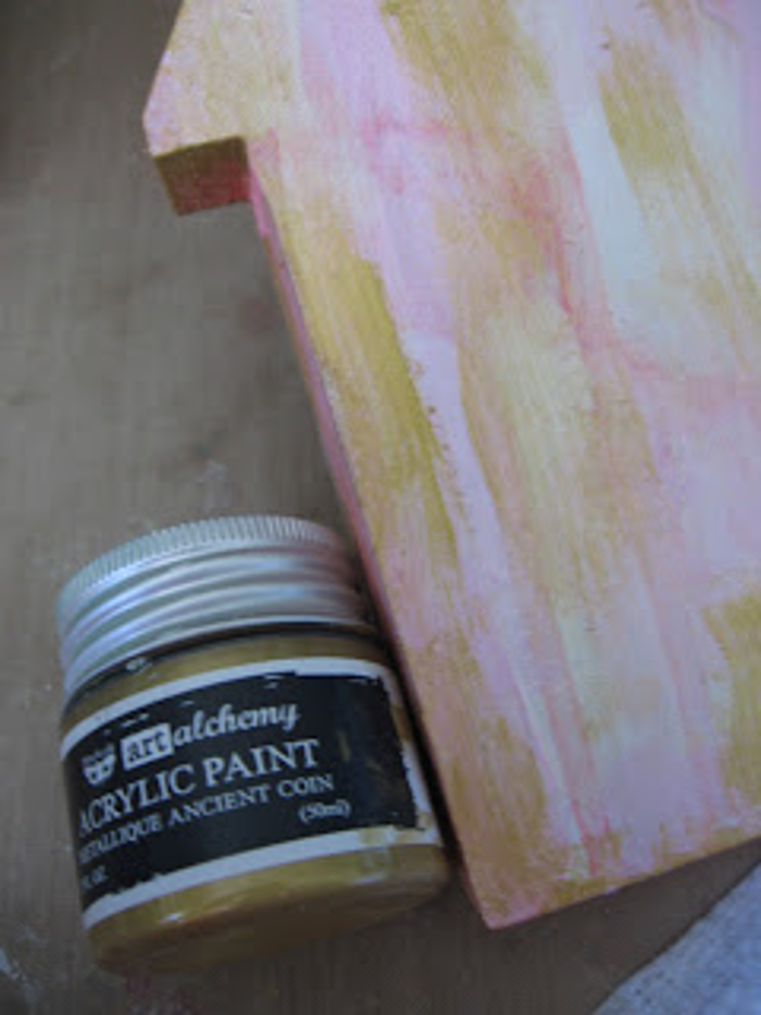 Once this was dry, I did the same thing with the Art Alchemy Metallique Ancient Coin paint. making sure to add some to the back, front, and both sides of the house.