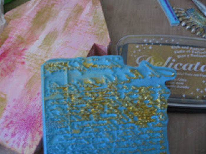 I used my heat tool to set the ink, and once it was dry, I applied gold ink to Joggles/ Margaret Applin Designs Vintage Correspondence Cling Rubber stamp and added this all over the house using the same method as earlier.