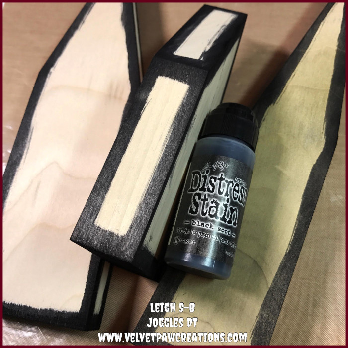 Apply Black Soot Distress Ink to all the flaps with a foam applicator. Tip: It’s much easier to do this by turning the panel over and folding the flaps in…you won’t accidentally get any black ink on the decorated sides this way.