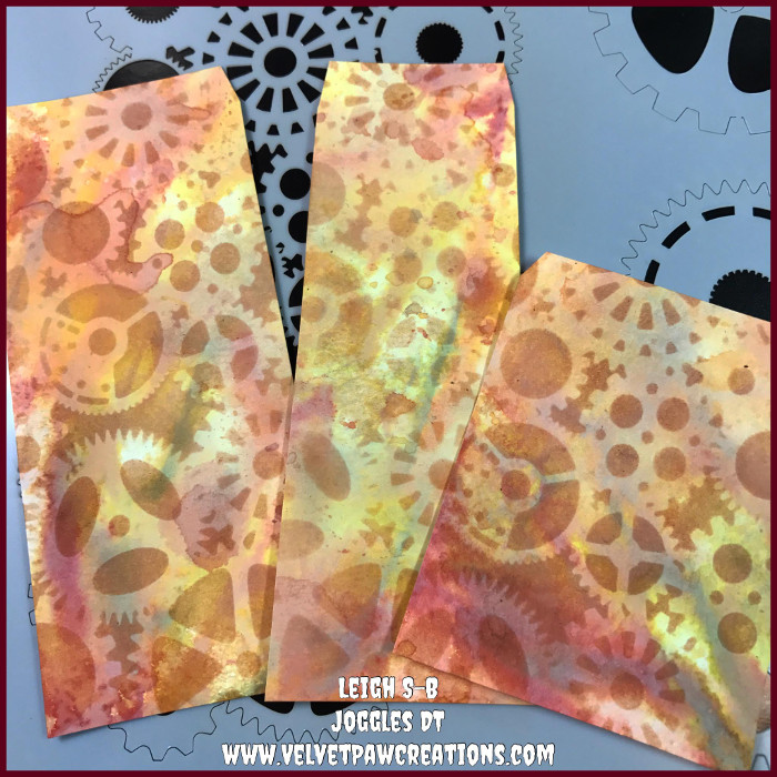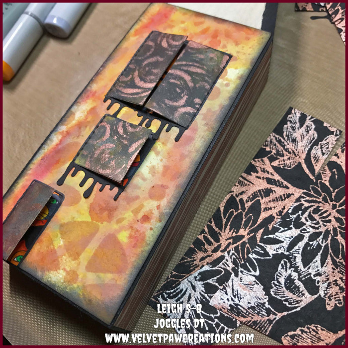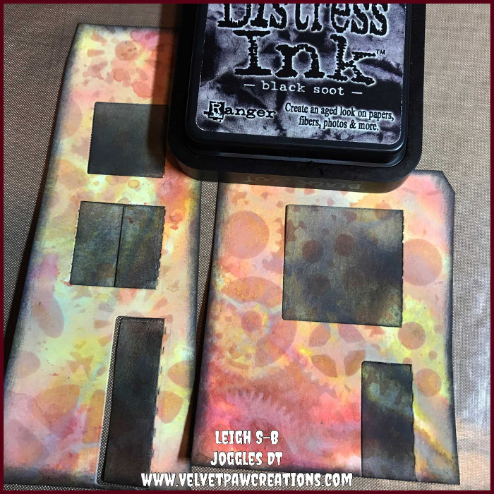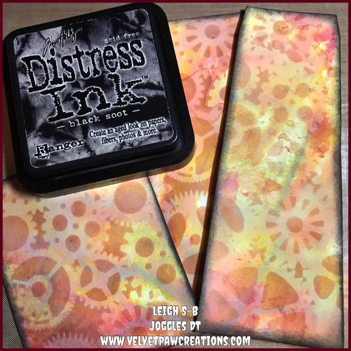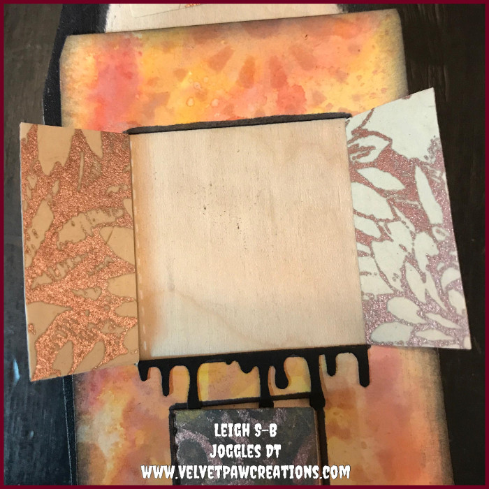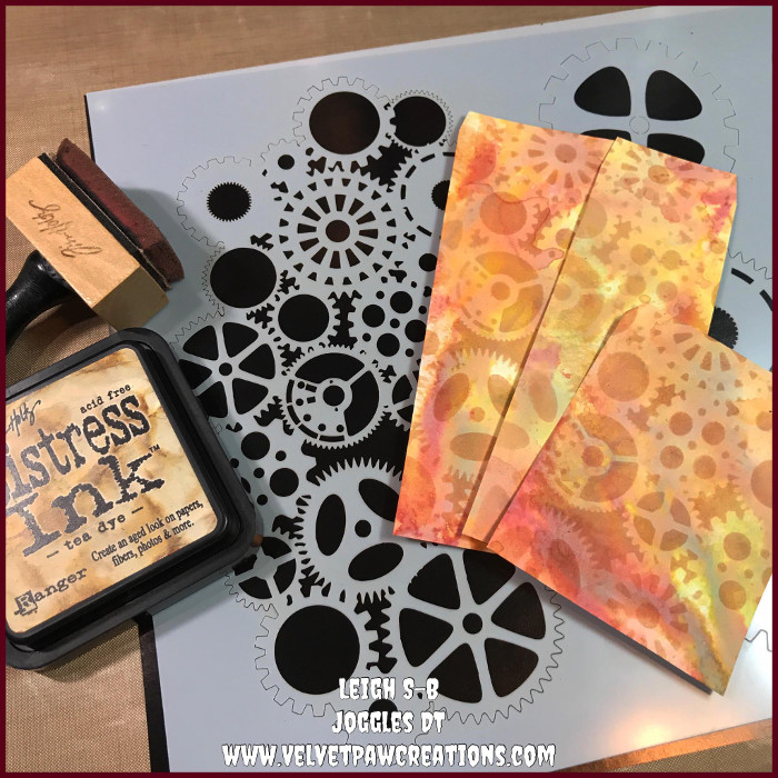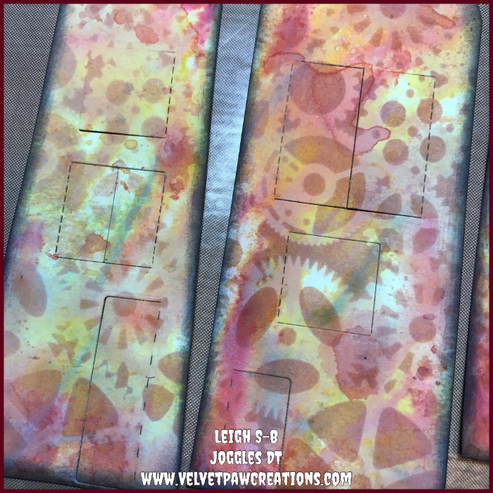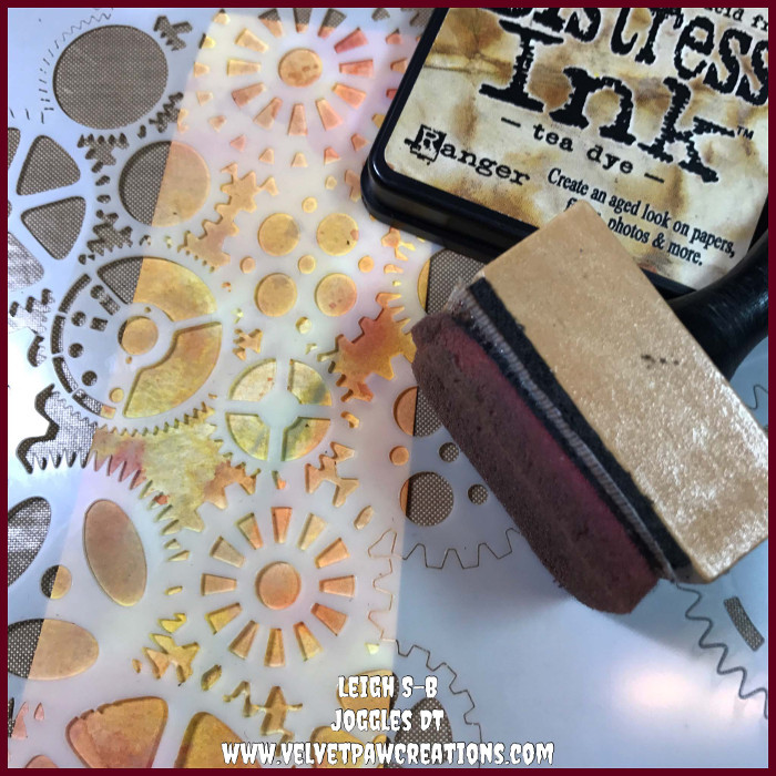 I decided to add some subtle pattern to the panels in Distress Tea Dye and chose a gears design…just coz I felt like it. I’m a huge Steampunk fan ;0) You can add whatever pattern you like or just leave it with the yummy Distress Oxide pattern. That’s the beauty of creating; just do whatever speaks to you!