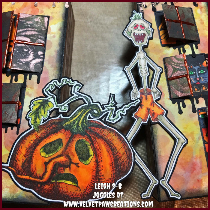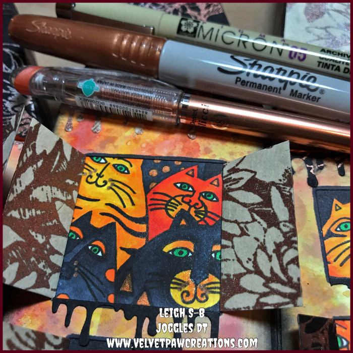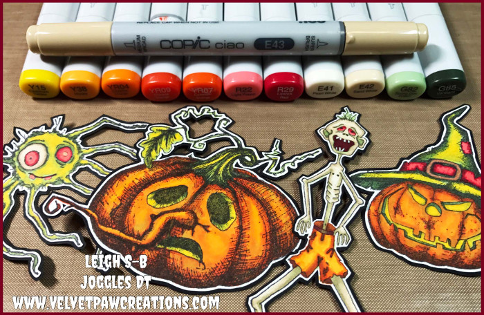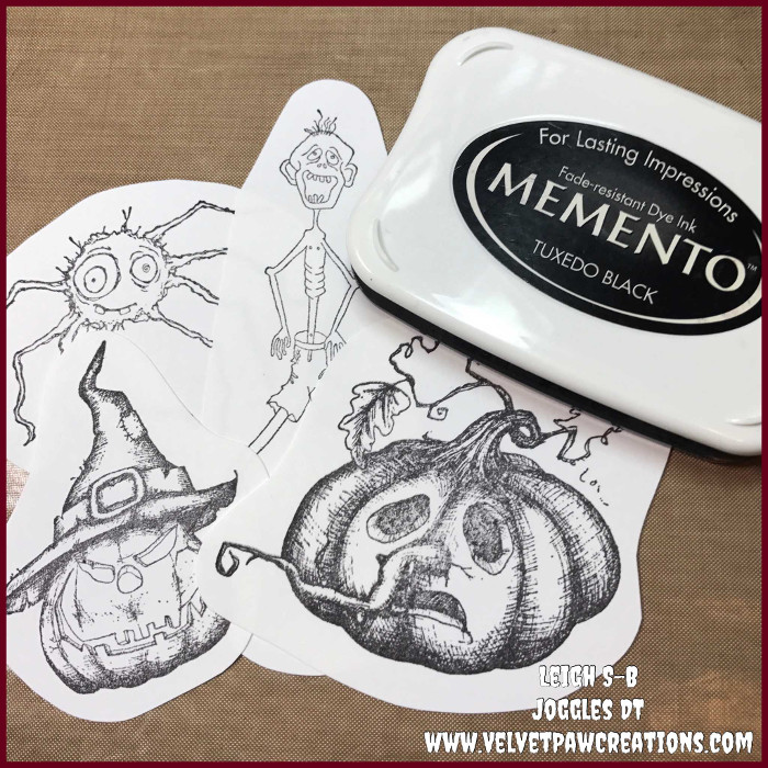 Colour all the images with Copics in shades of Fall/Autumn and Halloween. Fussy cut them all out leaving a narrow white border. Adhere them to black cardstock and fussy cut out again leaving a narrow black border. This fussy cutting technique helps strengthen any flimsy parts of the design, gives the stamped images a finished look, and also makes them pop nicely against the background.