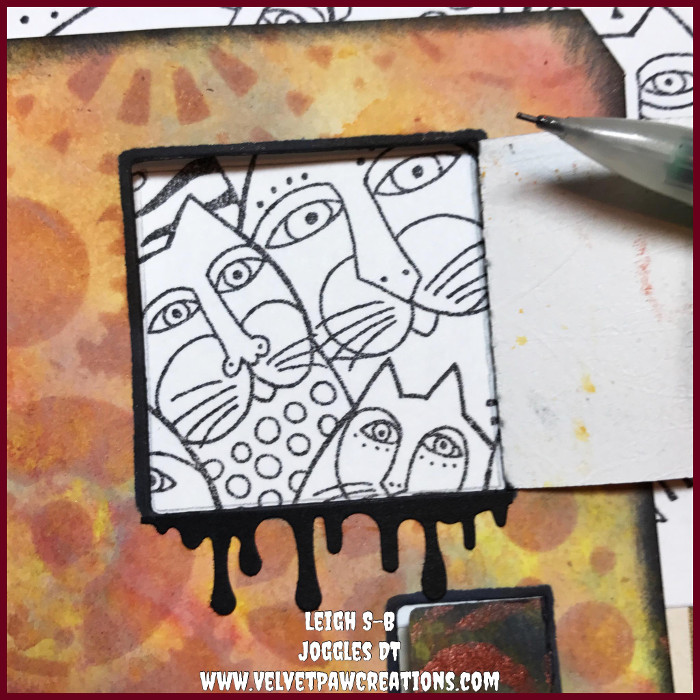 Next, stamp the Laurel Burch cats out twice and use the window/door cut outs in the panels to decide which parts of the design you’d like to use. Then trace the shapes onto the stamped images in pencil.
