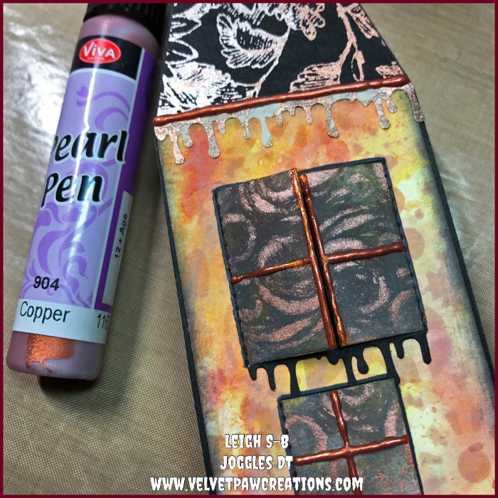Other: Brilliance Ink – Cosmic Copper; Memento Ink – Tuxedo Black; Neenah solar white cardstock; black cardstock; Lifestyle Crafts assorted window dies; Martha Stewart punch – Drips; Copic markers; Viva Pearl Pen – Copper; Prismacolor marker – black; pencil; ruler; scissors; craft knife; painter’s tape (low tack tape); paper towel; Copper Sharpie marker