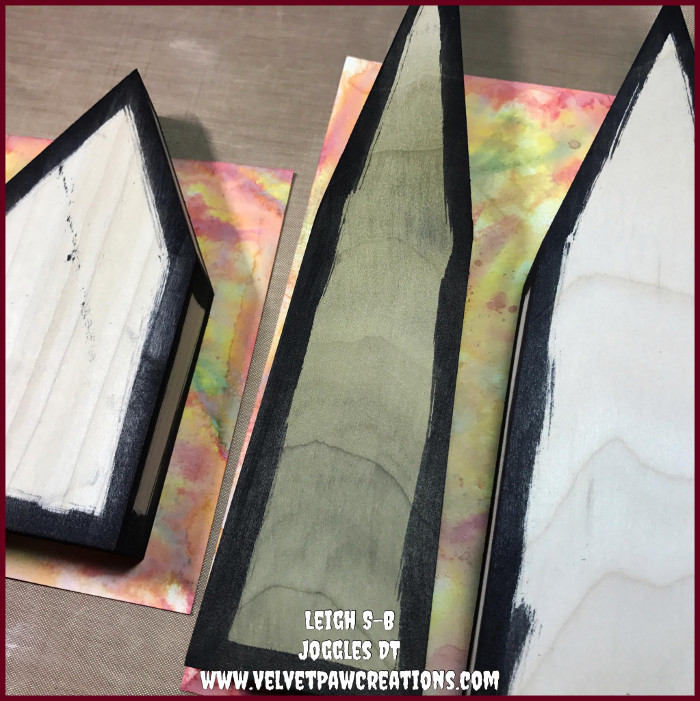 Start off by staining the wood houses with Black Soot Distress Stain. I like to do this step to give the project a “finished” look once completed. I only stained the edges of all the sides because the rest of the wood will be covered with paper but there’s nothing wrong with full coverage if you’d prefer.