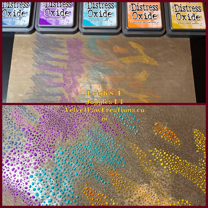 Spritz with water so the inks bead up on the surface of the craft sheet. A few spritzes will give you a deeper colour palette and more water will dilute the inks to produce a variety of lighter shades. Lay a sheet of white mixed media cardstock on top of the spritzed inks to create a fabulous watercolour background with instant gratification.