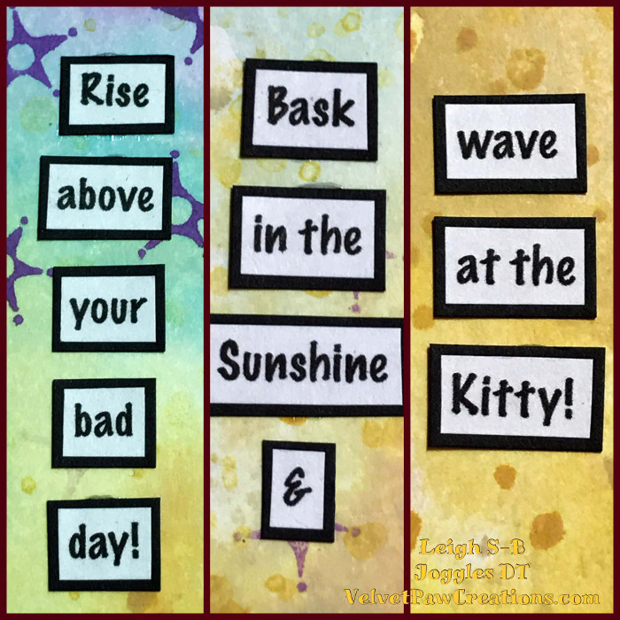 My project was actually inspired by a bad day. An artist draws inspiration from many sources and I used it to feed my creativity and created an inspirational message to match. I typed up the text in Photoshop CS6 and printed it out onto white paper. Fussy cut out the words, mount them on black cardstock and trim to leave a narrow border. If you’ve ever needed an excuse to hoard the smallest of scraps, then here you go…you NEED them to create sentiments for your projects….you’re welcome, LOL!