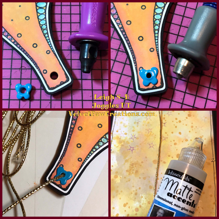 Other: black cardstock (two weights used);gold cord; eyelet; hole punch and eyelet setter tools; pop dots; paper trimmer; paint brush; scissors printed text; white mixed media cardstock; Inkssentials Matte Accents; black Fineliner pen;