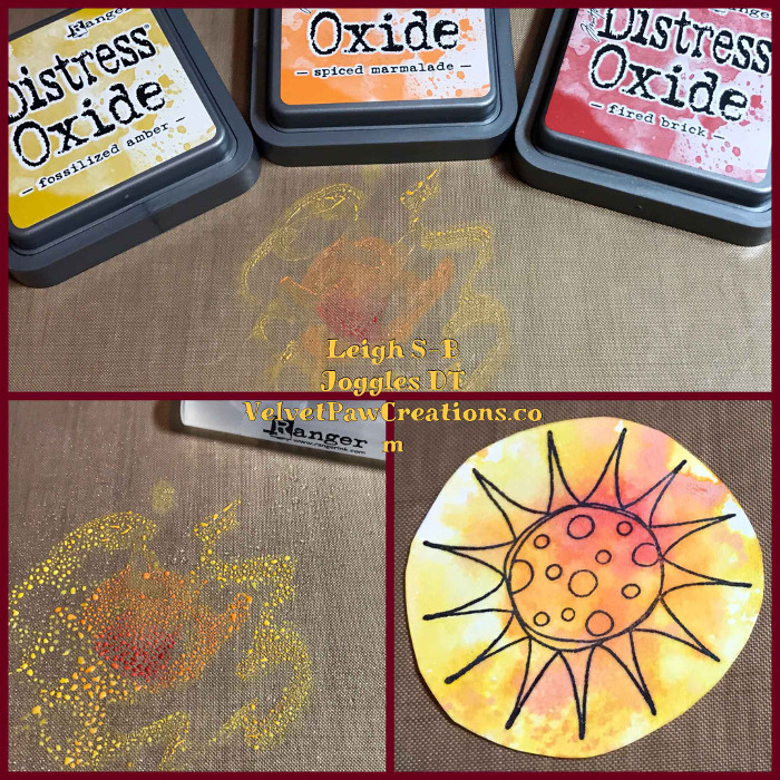 I applied colour to the sun the same way as I did the background. Smear DO Fossilized Amber, Spiced Marmalade, and Fired Brick onto the craft sheet, spritz with water, and lay the sun down onto the inks. You can paint it with a paintbrush, too, if you’d prefer.