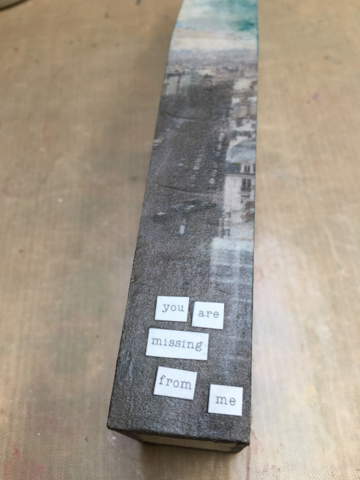 As the deli paper was laid down, I gently scraped an old credit card across the wood to smooth out potential air pockets, also applying matte medium to the outer surface on top of the deli paper. It was at that time when I noticed that some ink from the craft mat I was working on had transferred to the photo! I decided to embrace it.