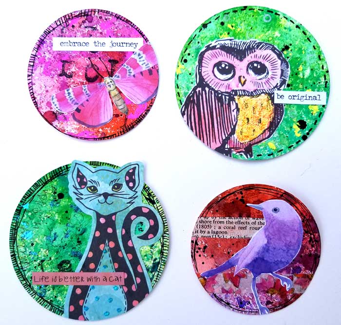 I found the process enjoyable and a little bit addicting.  It’s easy to finish quite a few in a single session and there’s always satisfaction that comes with finishing a project.  In the video you’ll see my simple ink backgrounds and options for focal images and embellishments.  All simple.  All fun.