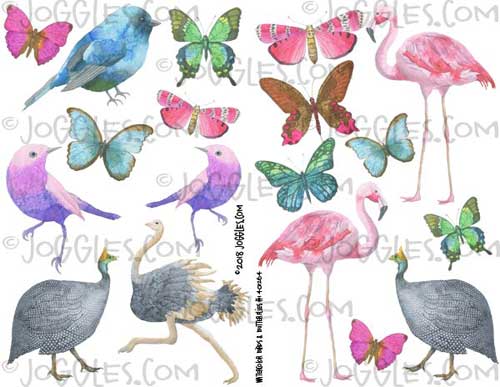 Even better is that we’re kicking off a new freebie offer today.  If you spend $25 we’ll give you a sampler package that includes 5 of each of the three sizes, plus half of one of our more popular collage sheets named Watercolor Birds And Butterflies 1.  It looks like this: