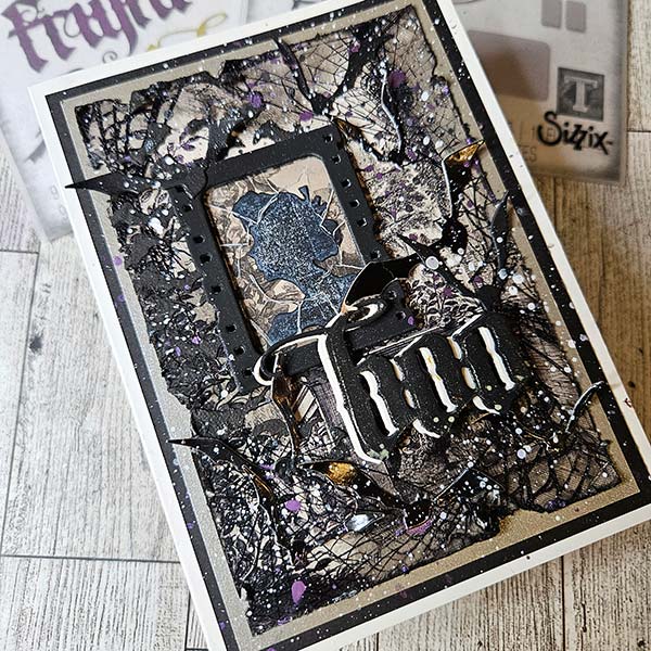 Time to get lost in the inky darkness with this spooky A2 card. The background comes together pretty fast, I used a glossy cardstock (wanted a little shine but you can use whatever you prefer) and did some heat embossing in black with cobwebs. Any cobweb stamp will work perfectly. I inked the edges heavily with Black Soot Distress Ink and allowed it to dry. After it was dry I roughed up the edges with my scissors to give it a really worn look, then I went back in with my Black soot to ensure it was really dark, and inky.