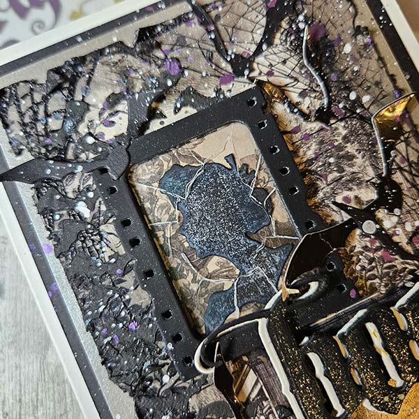 Add your sentiments and all your bats, then go to town splattering (mask off the portrait)!! Let it all dry and you have a haunting card for someone faboolous!