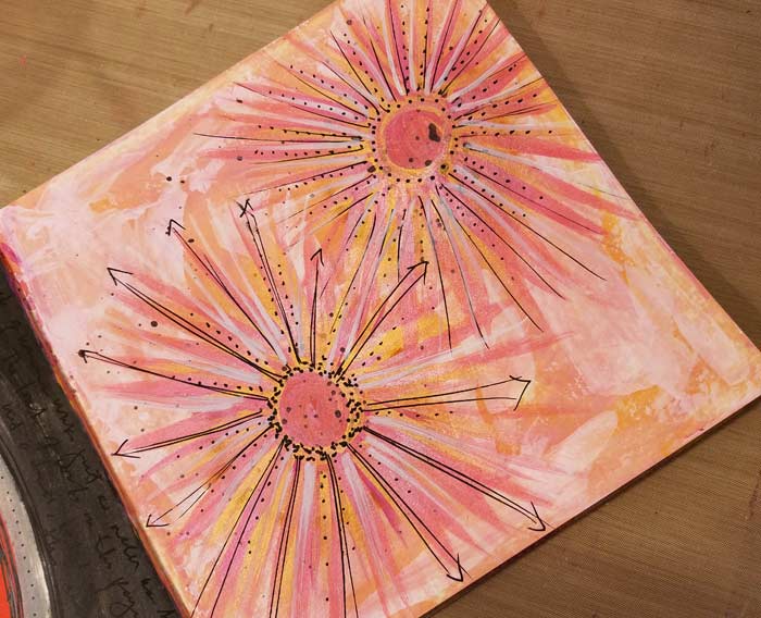 Then grabbed the White Medium Water Based Marker and added some white spokes from the center. I went back to the Extra Fine Black Sharpie and added a bunch of dots around the centers and radiating outward from them. And called it done!