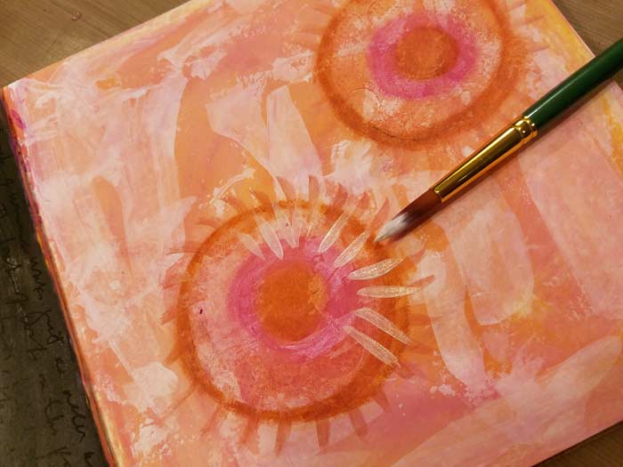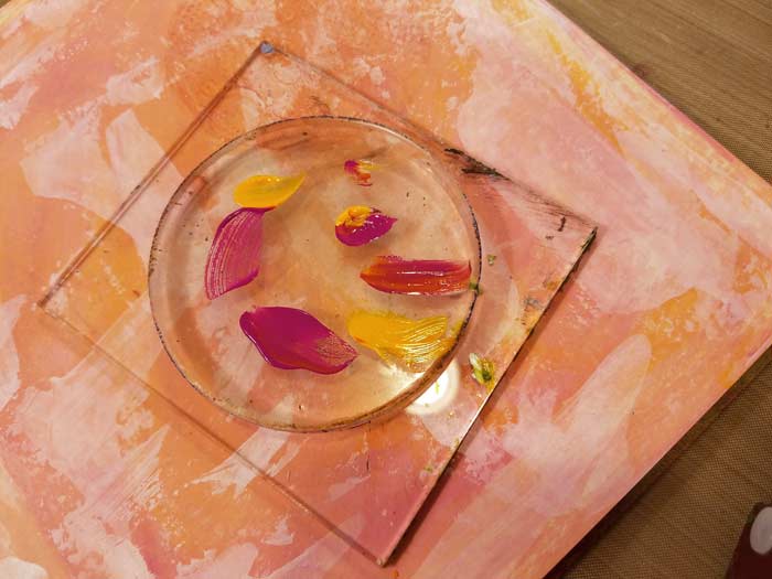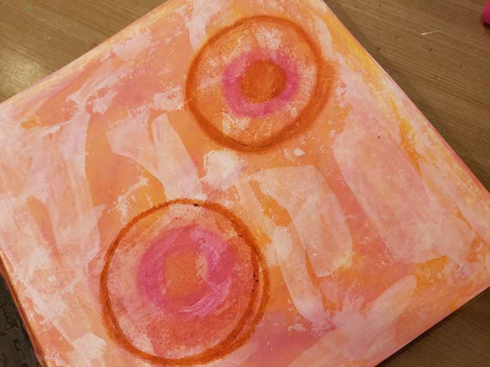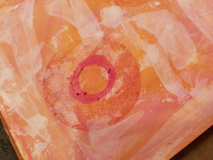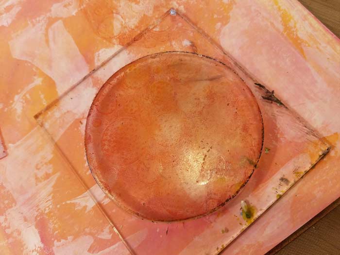 I want circles for the movement to spring form the center of so decided to use the 3″ circle Gel Press Plate that is included in the Petites Set A. I’m using the same Dylusions Paint. The 3″ Round Plate is mounted on our 4″ x 4″ Clear Acrylic Mount, which allows me to use it like a stamp.
