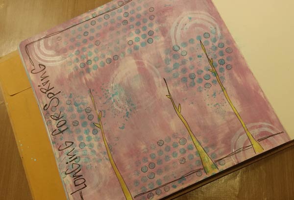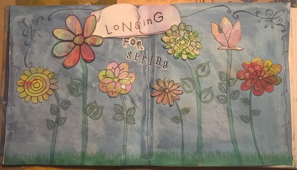By this point in the winter I’m always fed up and longing for spring, which is the theme of today’s page. This time I’m working on a single page as there are less than 52 complete spreads in the Square Kraft Dylusions Journal. At some point I’ll probably tip-in a page which will help get me to 52 for 2016.