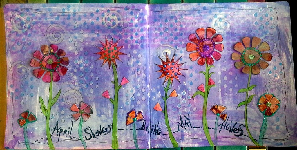 Awesome page. This one sort of reminds me of your two Joggles stencils, “Skinny Mini Flowers” and “Skinny Mini Flower Garden” – I was just about to dig them out to use on my calendar journal for April.